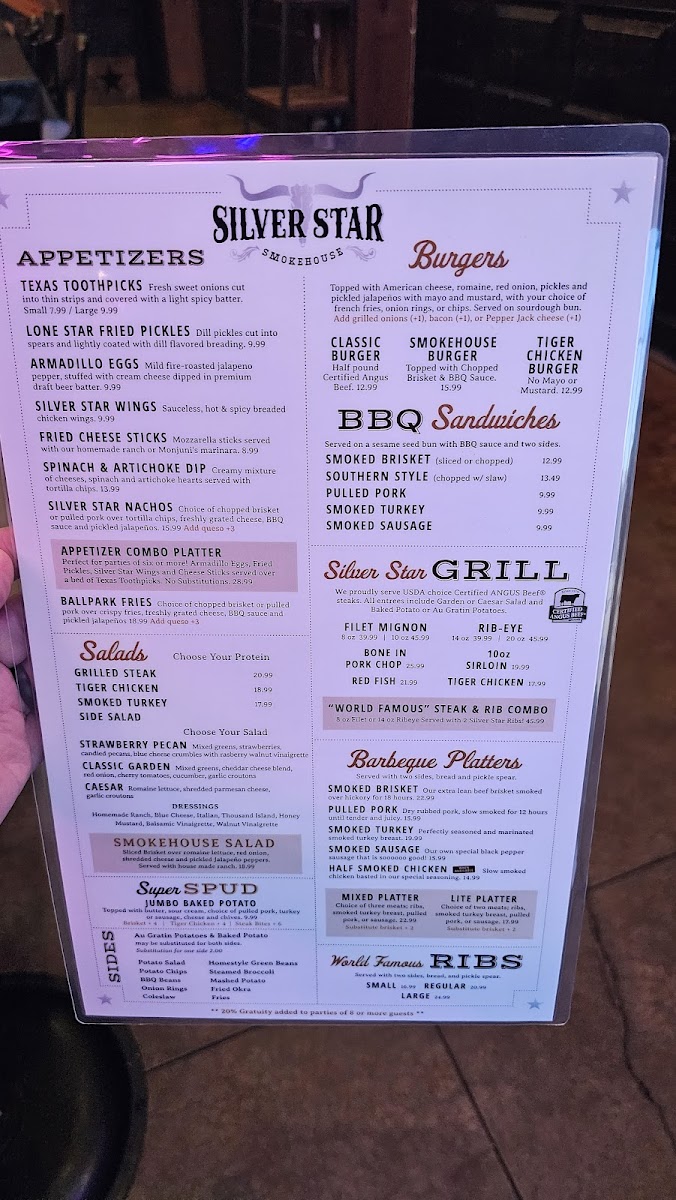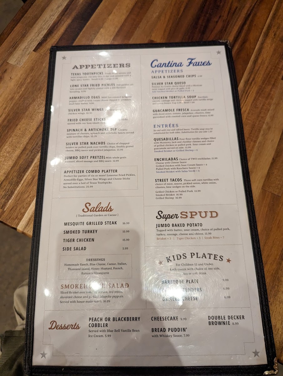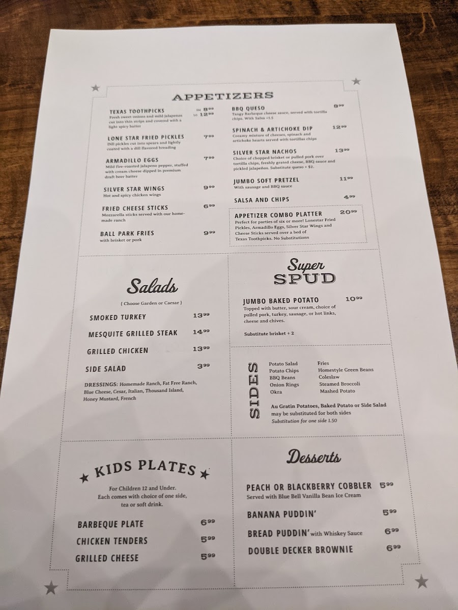 Perfect for parties of six or more! Armadillo eggs, Fried Pickles, Silver Star Wings and Cheese Sticks served over a bed of Texas Toothpicks. No Substitutions.